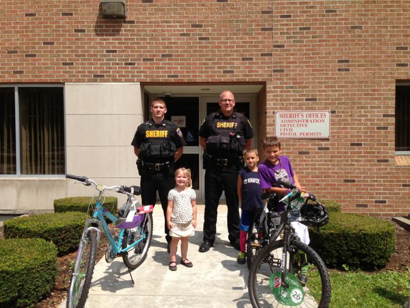 Two area youth are the proud recipients of new mountain bikes, courtesy of the Cattaraugus County Sheriff's Employees Benevolent Association and the New York State Police. Every year at the Cattaraugus County Fair in Little Valley, boys and girls are eligible to enter a drawing for one boy's bicycle and one girl's bicycle. This year's winners are, from left to right, Myleigh Houck of Delevan and Dylan Richardson of Allegany (Dylan's brother Hayden Richardson in background). Each youth also received a bicycle safety helmet donated by Walmart. Presenting the bicycles at the Cattaraugus County Sheriff's Office, are Deputy Matt Lundsten and Lt. David Schuman.