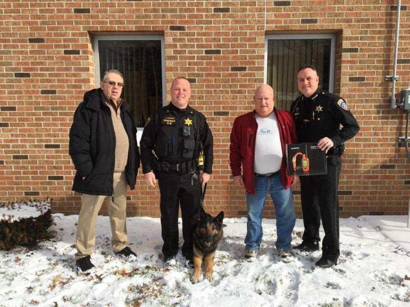 From left: Retired Trooper Bernie Pitass, Deputy Tim Pence, K9 Nichols, Donor Larry Speiser and Sheriff Tim Whitcomb